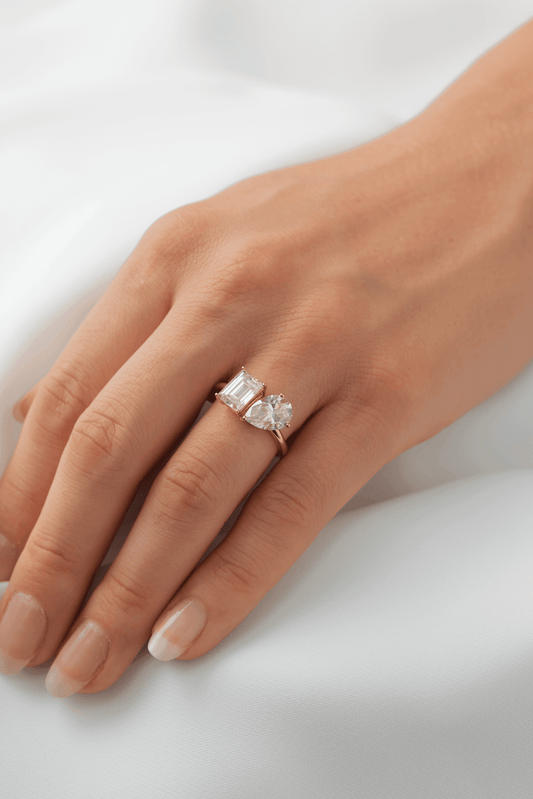 Emerald & Pear Cut Two-Stone Moissanite Engagement Ring - Ready To Ship